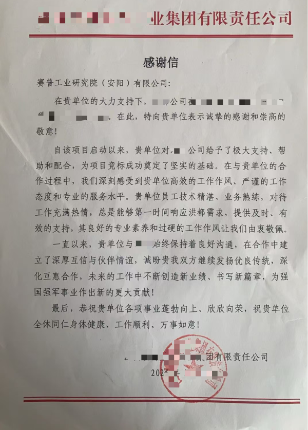近期,賽普工業(yè)研究院(安陽(yáng))有限公司(以下簡(jiǎn)稱(chēng)“賽普公司”)再次收到來(lái)自客戶(hù)的感謝信,客戶(hù)對(duì)公司在某特種裝備生產(chǎn)任務(wù)中提供的卓越支持予以高度評(píng)價(jià)。今年以來(lái),賽普公司已多次獲得客戶(hù)的書(shū)面感謝和電話(huà)感謝。贊譽(yù)的背后,是市場(chǎng)與客戶(hù)對(duì)賽普公司技術(shù)實(shí)力、服務(wù)品質(zhì)與履約精神的高度認(rèn)可與信賴(lài)。