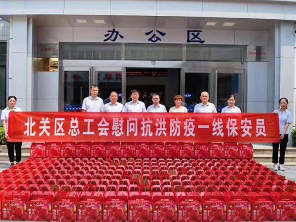 8月9日、10日北關(guān)區(qū)總工會(huì)副主席薛梅、保障部部長(zhǎng)司尚雯來(lái)到安陽(yáng)市洹河保安服務(wù)有限責(zé)任公司,送來(lái)抗洪防疫慰問(wèn)品鮮桃500多箱,向堅(jiān)守崗位、奮戰(zhàn)一線的保安隊(duì)員進(jìn)行慰問(wèn),提醒大家做好防控工作的同時(shí)一定要做好自身防護(hù)。