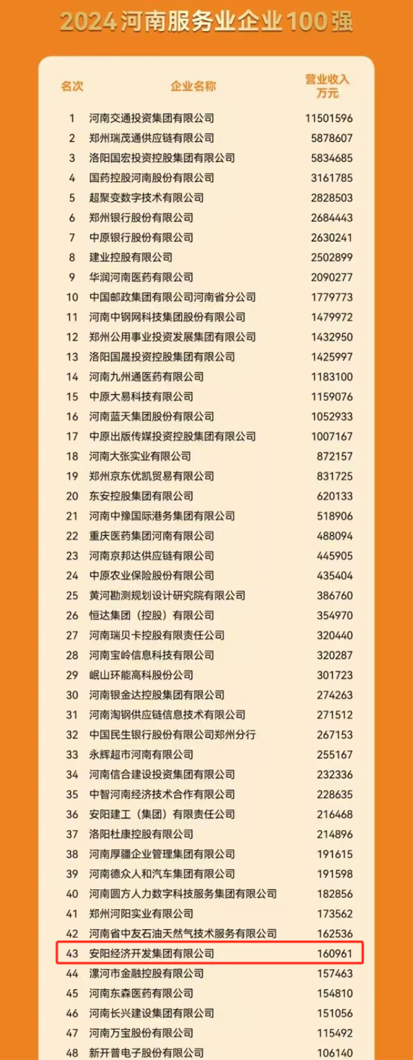 近日,集團在河南企業(yè)100強高峰會上入選“2024河南服務業(yè)企業(yè)100強”,位列榜單第43位,這是集團連續(xù)第3年獲此榮譽。