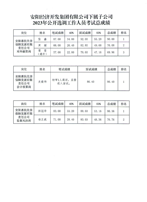 安陽經(jīng)濟開發(fā)集團有限公司下屬子公司2023年公開選調工作人員考試總成績公示