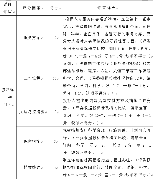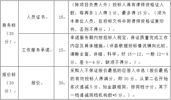 本次采購擬采用綜合評分法。綜合評價指標(biāo)體系,包括技術(shù)指標(biāo)(40%)、商務(wù)指標(biāo)(30%)、報價(30%)。排名前2的應(yīng)答人入圍,具體評分標(biāo)準如下: