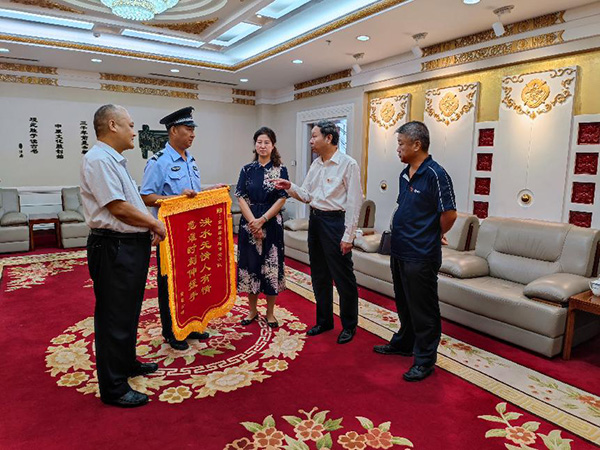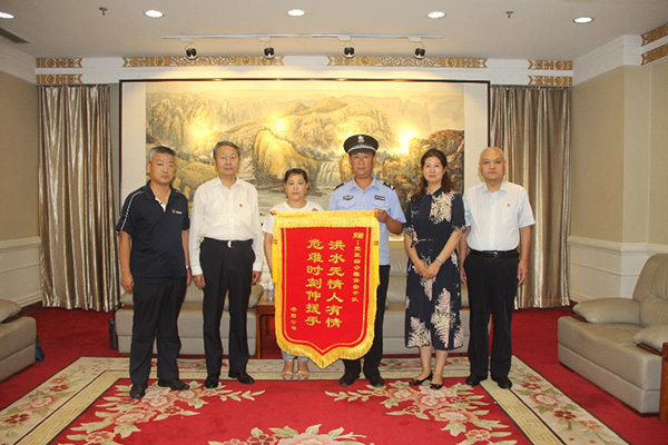 2021年7月28日下午3點(diǎn),“感謝你們,我這條命是你們撿回來的!”安勤公司員工曹運(yùn)玲拿著“洪水無情人有情,危難時(shí)刻伸援手”的錦旗在市黨政綜合大樓一樓會(huì)客室送到市黨政綜合樓保安中隊(duì)中隊(duì)長戶永豐手中,感謝他們的救命之恩。安陽市機(jī)關(guān)事務(wù)中心、三級(jí)調(diào)研員陳紹華,機(jī)關(guān)事務(wù)中心、保衛(wèi)科長孫文勝;安陽市安勤商務(wù)公司董事長兼總經(jīng)理劉全喜,安勤商務(wù)公司副總經(jīng)理王軍;安陽經(jīng)開集團(tuán)黨委委員副總經(jīng)理劉志霞;洹河保安公司黨委委員、副總經(jīng)理魏東,總經(jīng)理助理、人防分公司經(jīng)理李向陽,參加此次活動(dòng)。