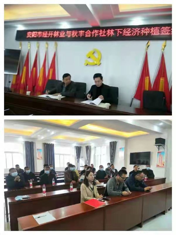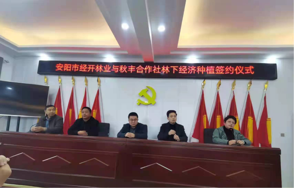 2022年3月9日,經(jīng)開(kāi)林業(yè)公司與曲溝鎮(zhèn)秋豐合作社在曲溝鎮(zhèn)東彰武村舉行安陽(yáng)市國(guó)儲(chǔ)林項(xiàng)目林下經(jīng)濟(jì)合作開(kāi)發(fā)簽約儀式,本次簽約儀式由曲溝鎮(zhèn)副鎮(zhèn)長(zhǎng)王安玉主持,殷都區(qū)林業(yè)局、經(jīng)開(kāi)林業(yè)公司及秋豐合作社相關(guān)人員出席簽約儀式。